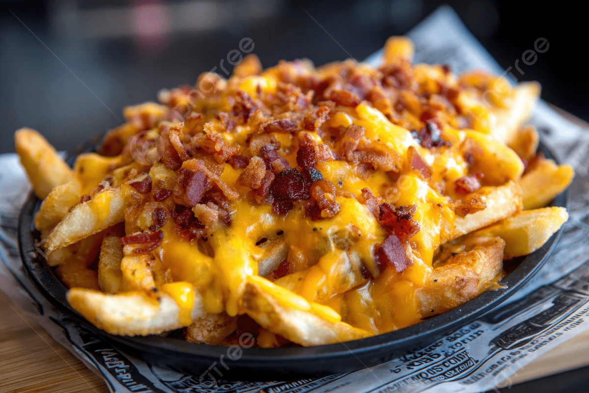 Papas fritas con queso cheddar y tocino crujiente